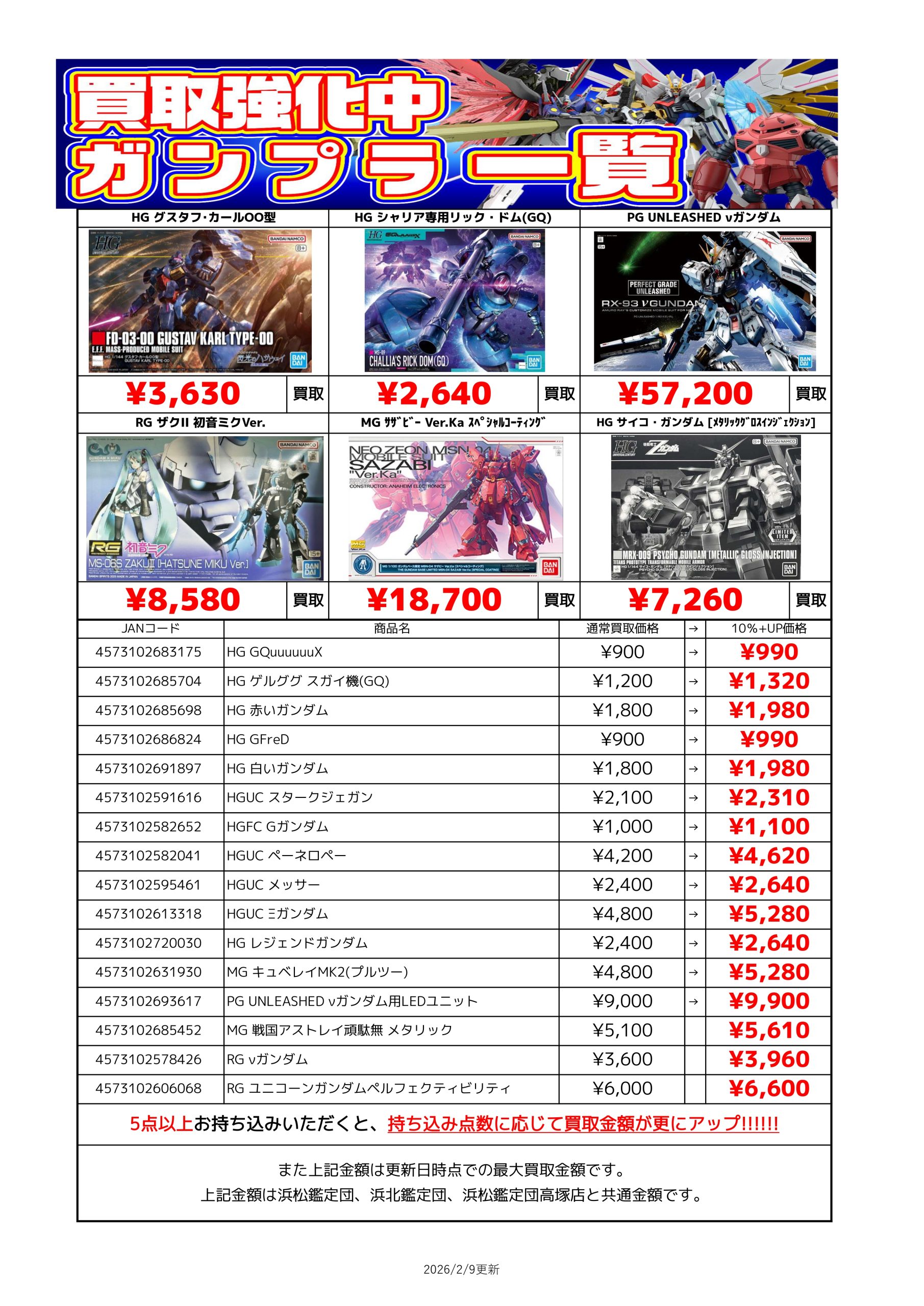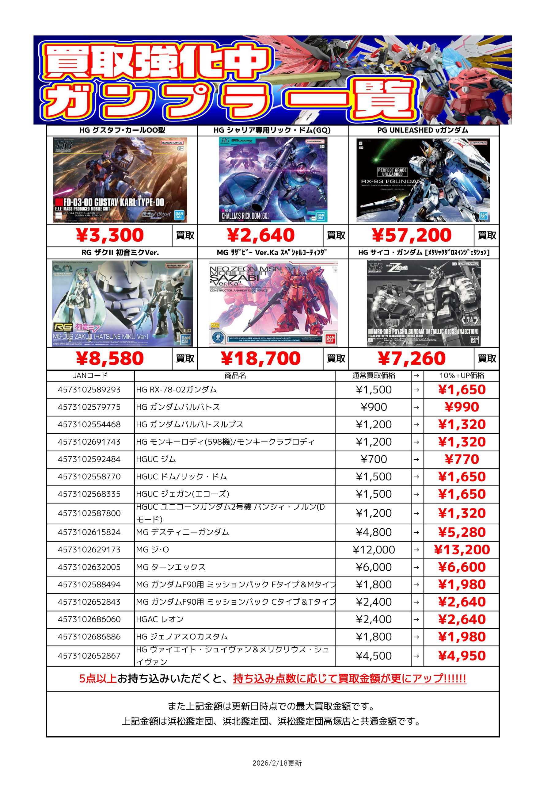 🔧 2/18更新 ガンプラ買取価格(一部抜粋)